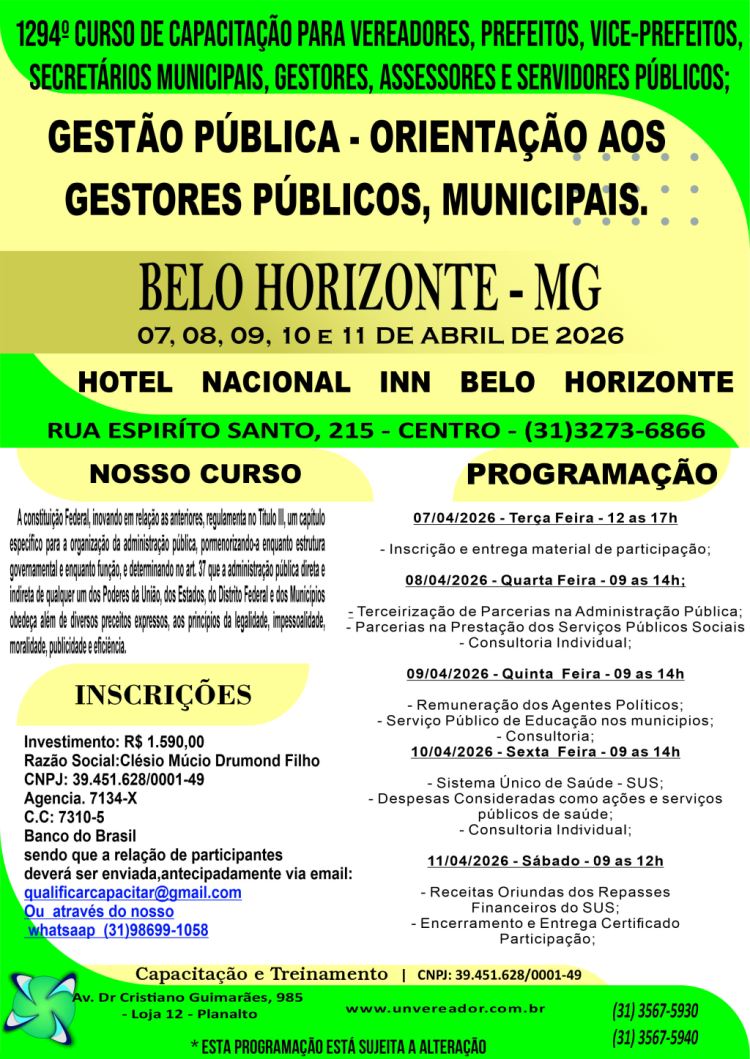 1294º - 07, 08, 09, 10 e 11 de Abril - BELO HORIZONTE - MG